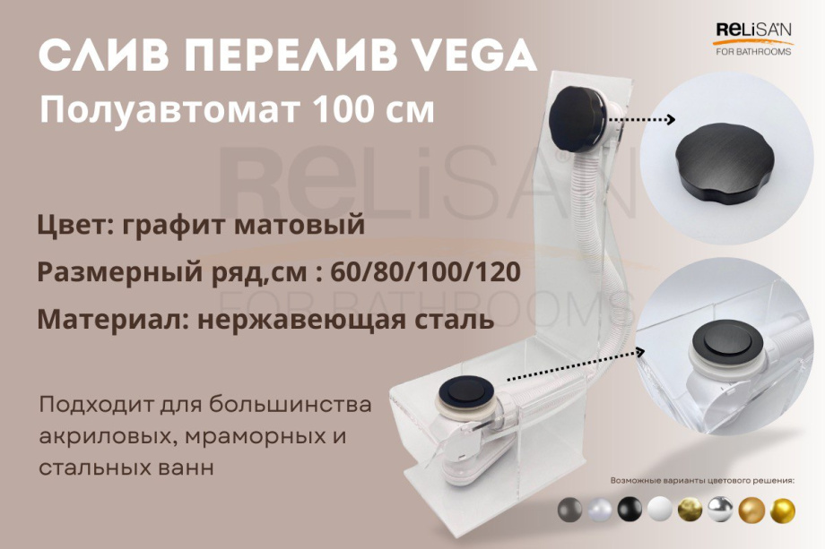 Слив перелив п/автомат Vega V55К 100см графит матовый