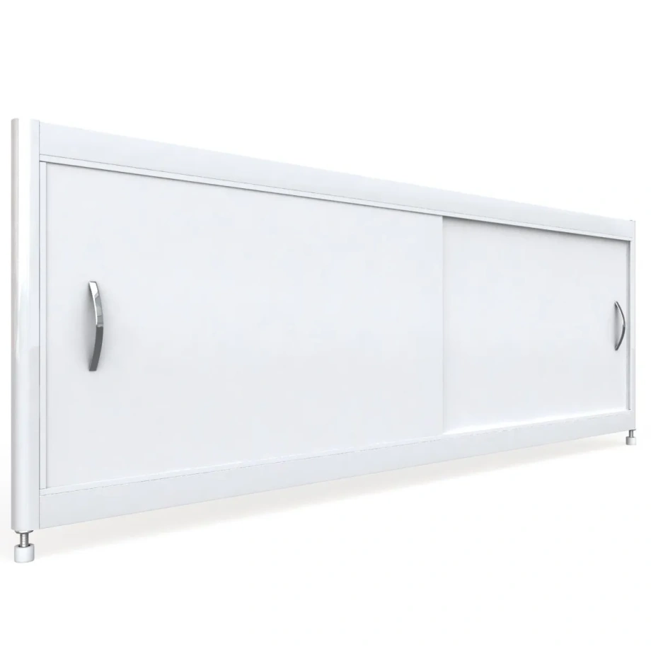 Адаптируется под любую длину ванн до 130 см. Каркас из алюминиевого профиля с полимерным покрытием белого цвета, толщиной 20 мм. Панели вспененный ПВХ толщиной 5 мм. Две раздвижные дверцы. Две дверные ручки цвета хром. Две ножки.