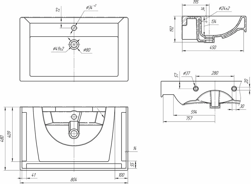 Раковина с отверстием под смеситель и переливом - 800х470 см ШхГ мм.