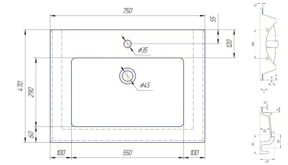 Раковина с отверстием под смеситель и переливом. Ширина - 1003 мм. Глубина - 520 мм.