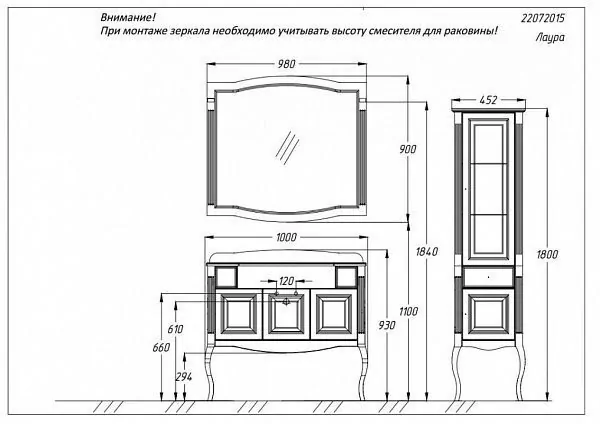 Тумба Лаура 100 (массив бука), мраморная столешница Дайна Реале, раковина CREAVIT фаянс, зеркало Лаура 100.