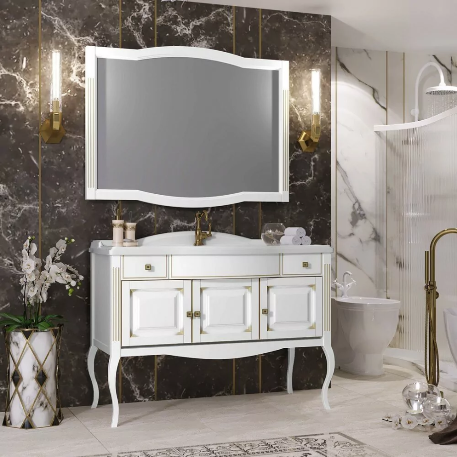 Мебель для ванной Opadiris Лаура 120 комплект, напольный, белый матовый с бежевой патиной.