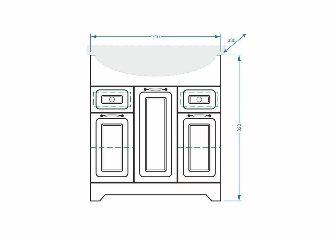 Раковина с отверстием под смеситель и переливом. Ширина - 760 мм. Глубина - 510 мм.