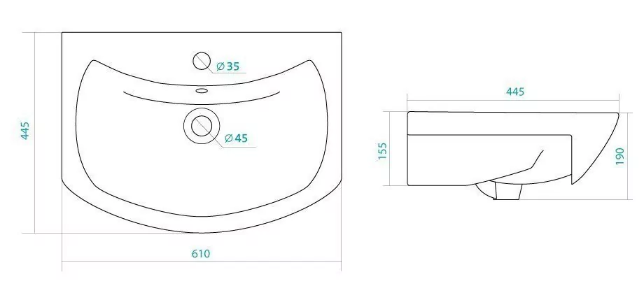 Раковина с отверстием под смеситель и переливом. Ширина - 610 мм. Глубина - 445 мм.