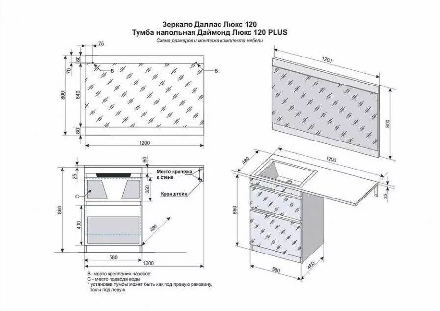Мебель для ванной Style Line Даймонд 120 Люкс Plus левая, комплект, напольный, белый