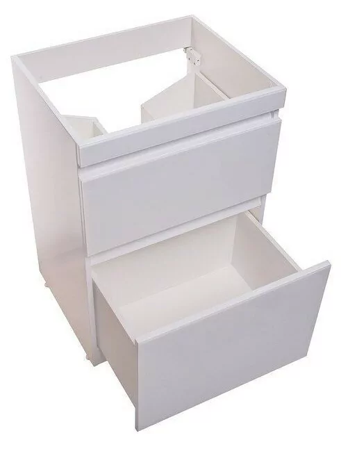 Размер тумбы: 580x480x860 мм. С механизмом доводчика, обеспечивающим плавное закрывание. Материал корпуса: МДФ. Покрытие корпуса: пленка. Материал фасада: МДФ/стекло. Покрытие фасада: пленка/эмаль. Два ящика.