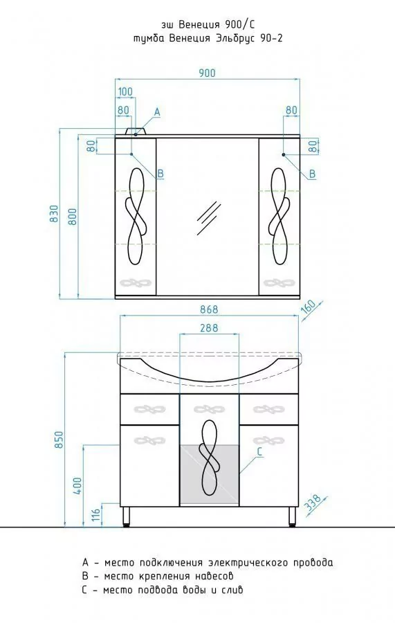 Размер зеркала Венеция 90/С: 900x160x830 мм. Материал корпуса: ДСП. Покрытие корпуса: ламинат. С электровыключателем (механической кнопкой). Фурнитура: хром. С механизмом доводчика, обеспечивающим плавное закрывание. Зеркало с розеткой.