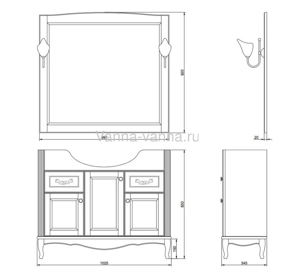 Раковина - 1060х480 мм. Тумба - 1025х830х345 мм. Зеркало - 911х920х20мм.