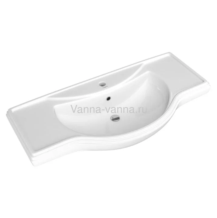 Три ящика, две двери. Цвет - белый. Ручки - бронза. Корпус - натуральное дерево. Фасады - натуральное дерево. Полки - ламинированная ДСП. Ножки - натуральное дерево. Раковина - фаянс. Ящики с механизмом полного выдвижения.