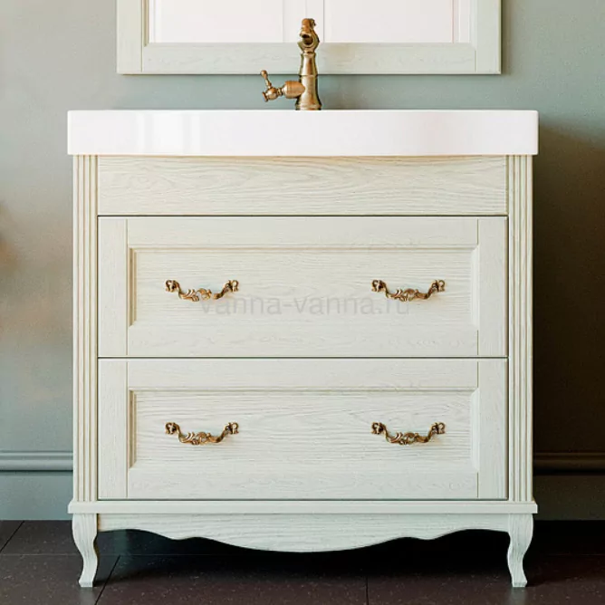 Цвет - слоновая кость. Ручки - бронза. Корпус - натуральное дерево. Фасады - натуральное дерево. Ножки - натуральное дерево. Раковина - фаянс. Два ящика с механизмом полного выдвижения.