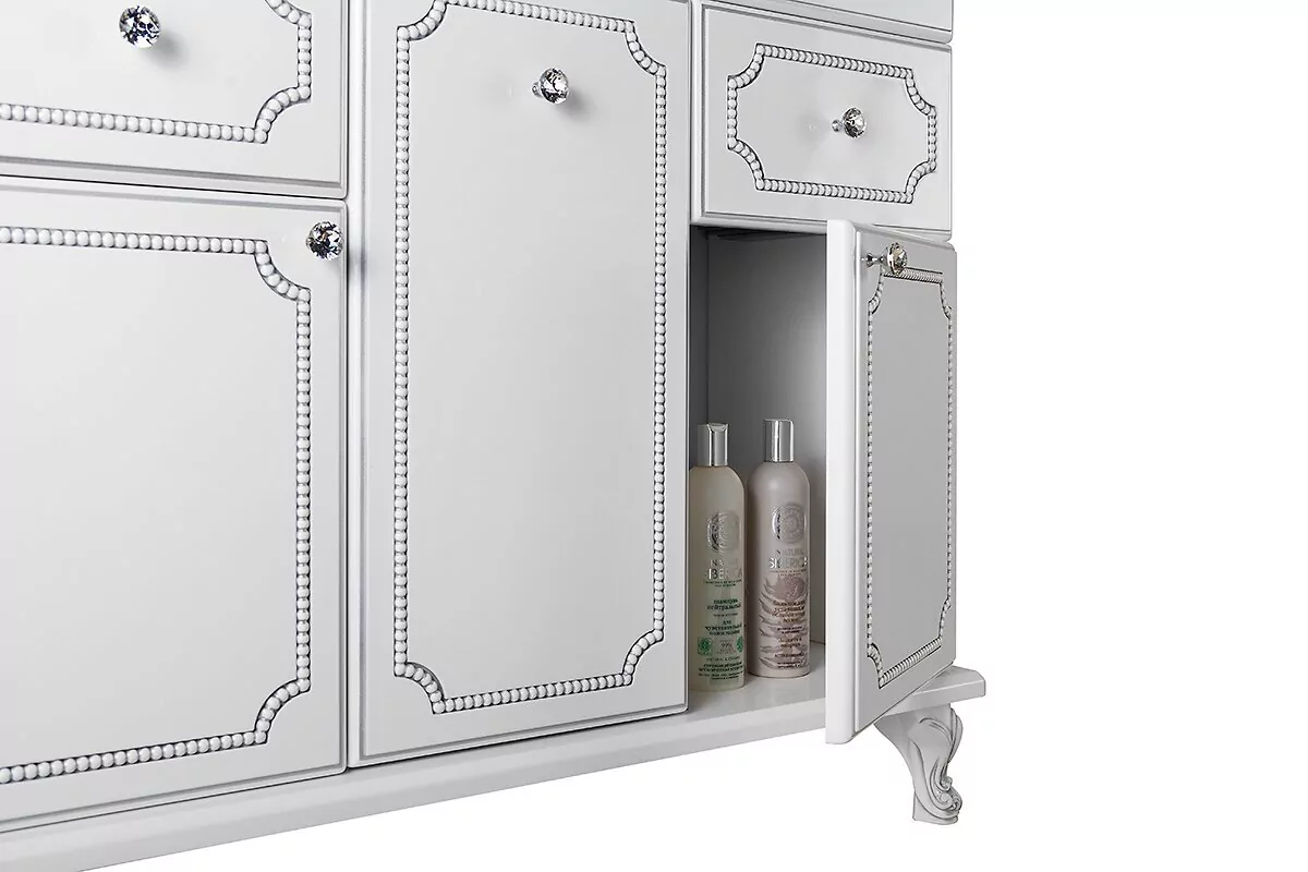 Тумба с раковиной Vod-ok Elite Мариэль 75. Напольная. Две двери, один ящик. Цвет - белый. Патина серебро, золото (на выбор). Ручки стекло, хром или золото. Цвет на выбор по RAL + 20 %, под заказ.