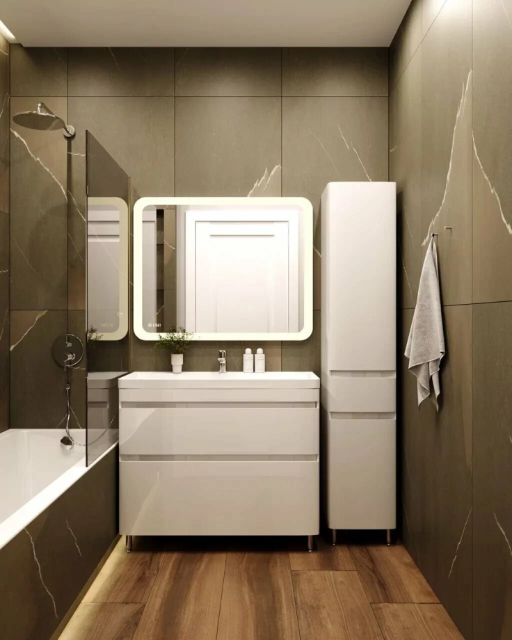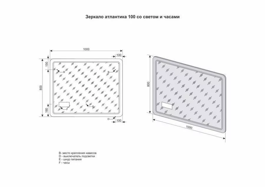 Размер раковины Атлантика 100: 1000x25x800 мм. Материал корпуса: ДСП. Подсветка в полотне. С электровыключателем (механической кнопкой). Дополнительное оснащение зеркала: часы/подвесы.