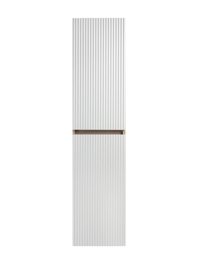 Шкаф пенал для ванной комнаты RUNO МОДЕНА (подвесной) – это изысканность и утончённая роскошь в интерьере. Волнистые рифленые фасады визуально «оживляют» и «приводят в движение» всю обстановку комнаты, сохраняя при этом умиротворение и покой, превосходно сочетаются с древесной фактурой и текстурой необработанного натурального камня корпуса. Цвет корпуса в двух цветах: текстура светлого дерева или необработанного натурального камня. Цвет фасада классический – белый глянец, идеально впишутся в любой интерьер ванной комнаты. Шкаф в ванную комнату оснащён двумя распашными дверцами, в каждом отделении по одной встроенной полке. Каждая дверца укомплектована двумя петлями, верхняя с доводчиком, нижняя без доводчика. Мебель для ванной RUNO - красота и практичность в мелочах, шкаф пенал для ванной комнаты Модена – лучший выбор для Вашей ванной комнаты!