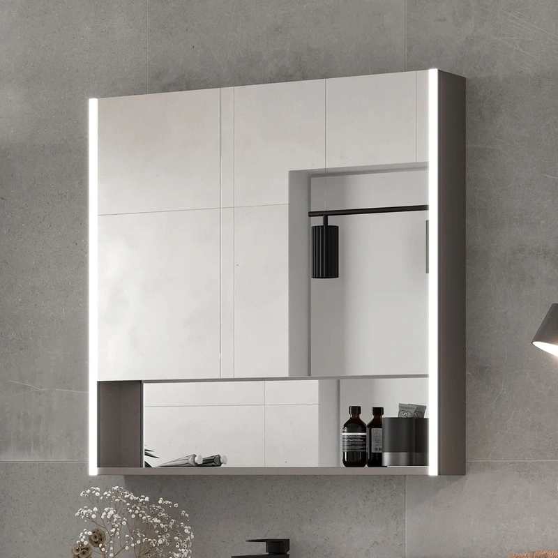 Зеркальный шкаф с фронтальной LED-подсветкой в алюминиевом профиле и розеткой. Управление подсветкой осуществляется при помощи датчика движения. Корпус изготовлен из ВЛДСП, фасад - из МДФ в пленке ПВХ. Петли на дверце оснащены доводчиками.