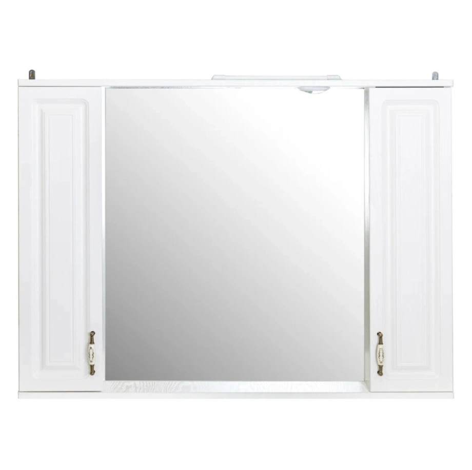 Преимущества: два шкафчика с удобными дверками на доводчиках – плавное и бесшумное закрывание; 4 съемные стеклянные полки (по 2 в каждом шкафчике) – регулируемое пространство для хранения; открытая полка снизу (глубиной 11,5 см) – для часто используемых предметов; современная LED-подсветка (4000 К) – естественный комфортный свет.