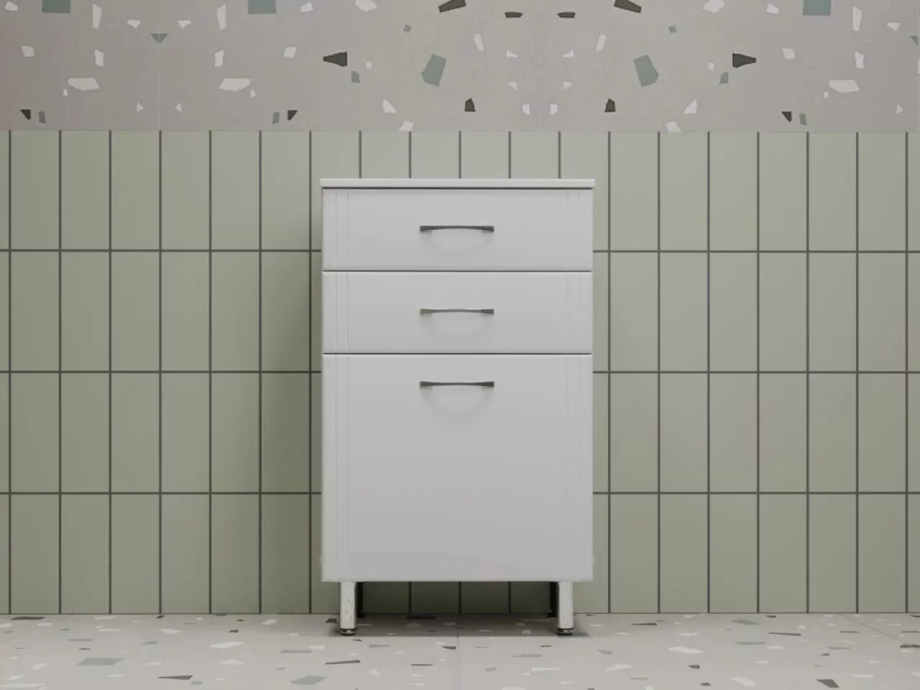 Одна дверь. Два ящика. Ручки накладные - 3 шт. Материал корпуса - ДСП. Покрытие корпуса - ламинат. Материал фасада - МДФ. Покрытие фасада - пленка ПВХ.