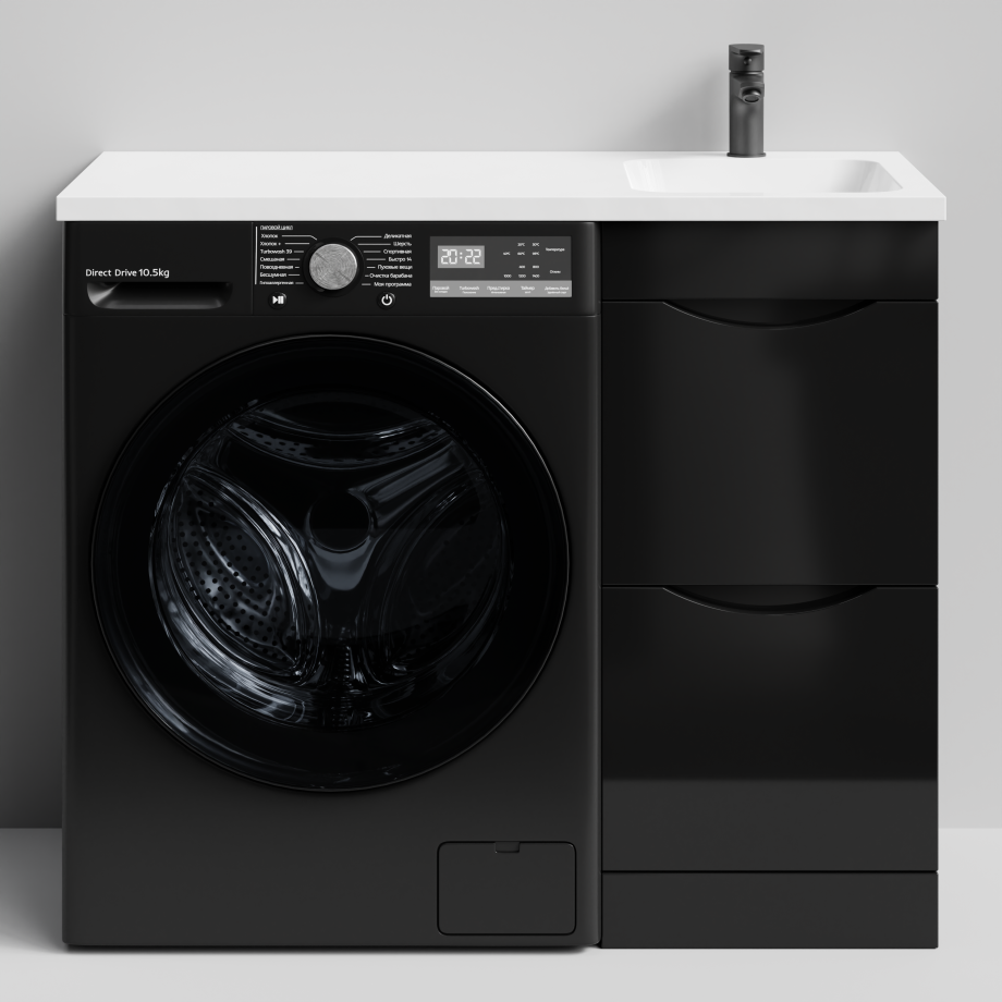 Тумба Vod-ok 38 с раковиной Смайл 100 напольная, под стиральную машину, правая, черный глянец