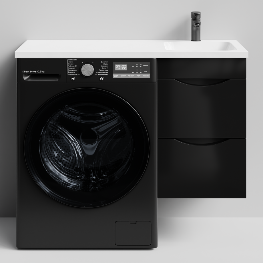 Тумба Vod-ok 38 с раковиной Смайл 100 подвесная, под стиральную машину, правая, черный глянец