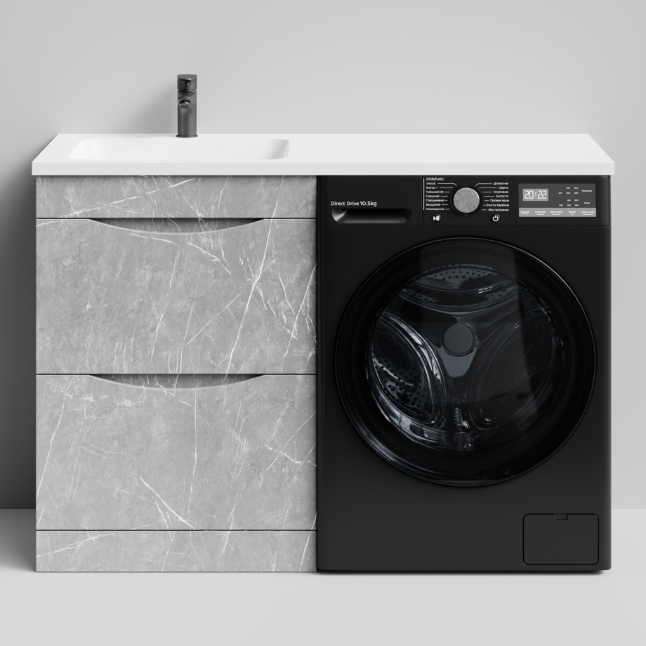 Тумба Vod-ok 58 с раковиной Смайл 120 напольная, под стиральную машину, левая, Мрамор Белый софт тач