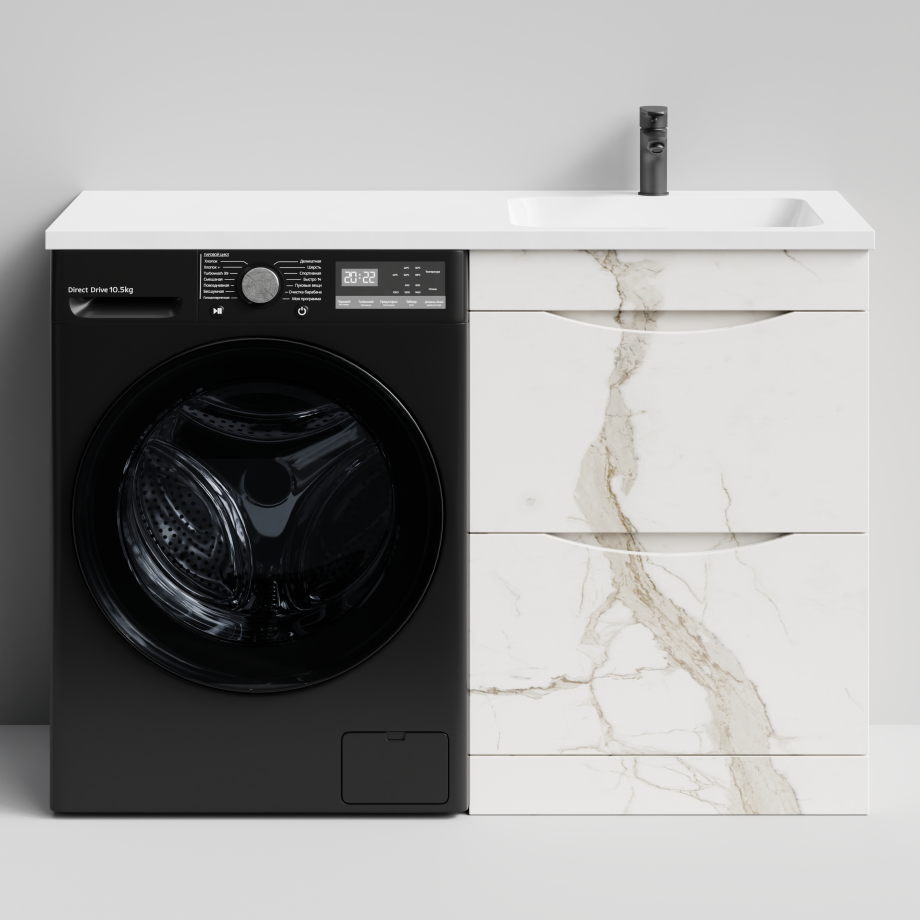 Тумба Vod-ok 58 с раковиной Смайл 120 напольная, под стиральную машину, правая, Мрамор Белый натур милк