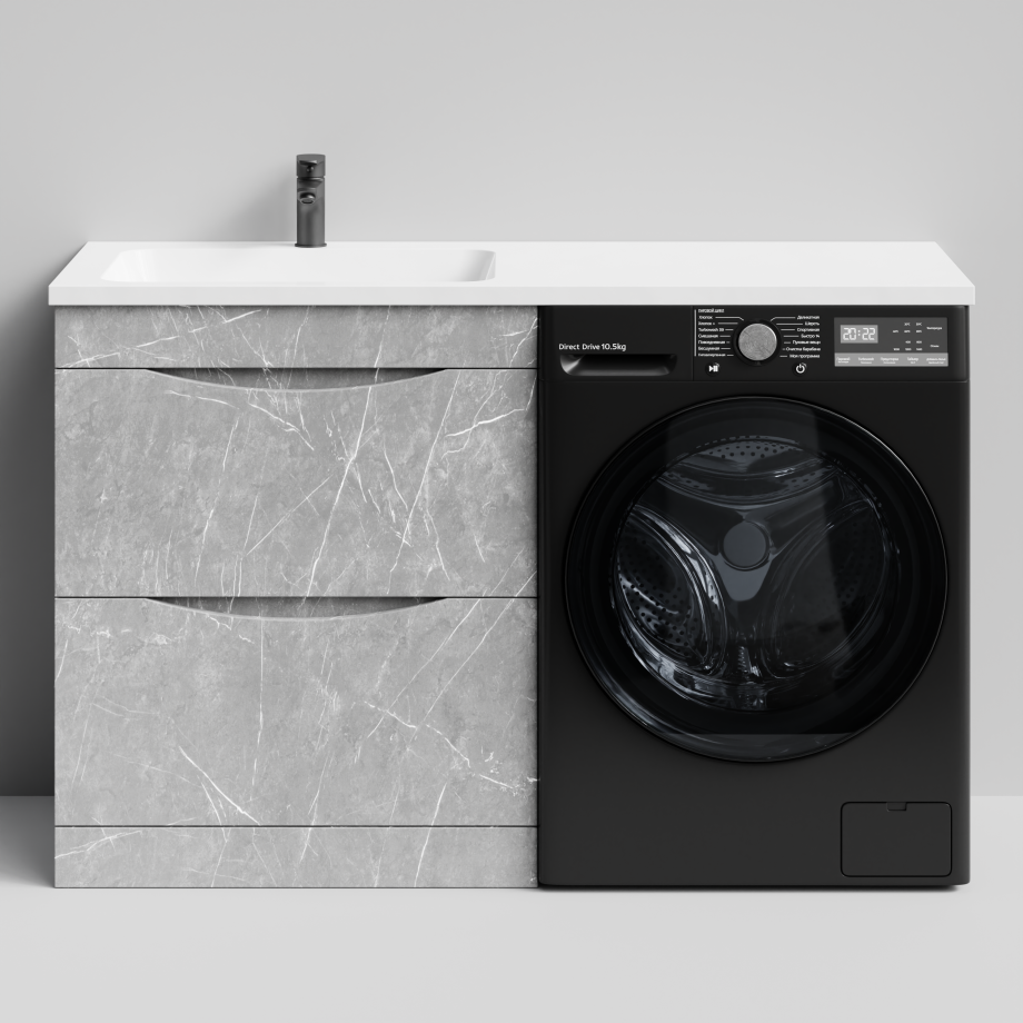 Тумба Vod-ok 68 с раковиной Смайл 130 напольная, под стиральную машину, левая, Мрамор Белый софт тач