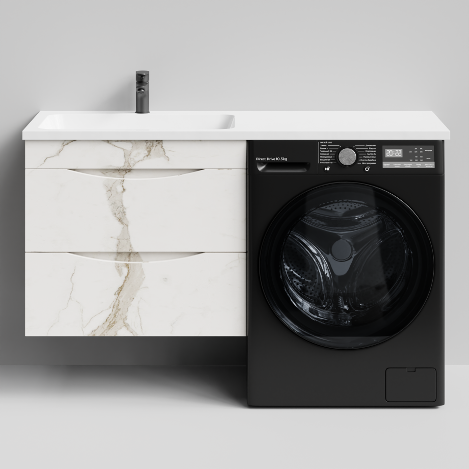 Тумба Vod-ok 68 с раковиной Смайл 130 подвесная, под стиральную машину, левая, Мрамор Белый натур милк