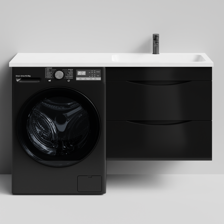 Тумба Vod-ok 68 с раковиной Смайл 130 подвесная, под стиральную машину, правая, черный глянец