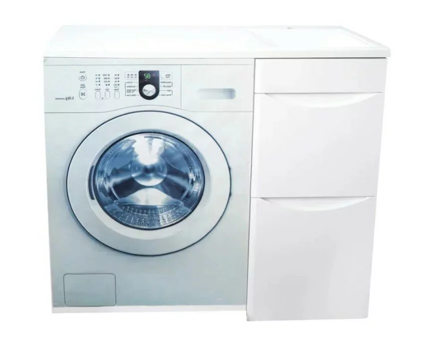 Тумба под раковину Bellezza Олиссия 100 R. Характеристики: Цвет: белый. Материал корпуса: влагостойкая ЛДСП. Покрытие: краска, глянцевое. Материал фасада: МДФ. Покрытие: краска, глянцевое. Система хранения: 2 выдвижных ящика с направляющими для плавного и бесшумного закрывания. Место под стиральную машину. Габариты (ШхВхГ): 39x85x47 см. Монтаж: напольный.