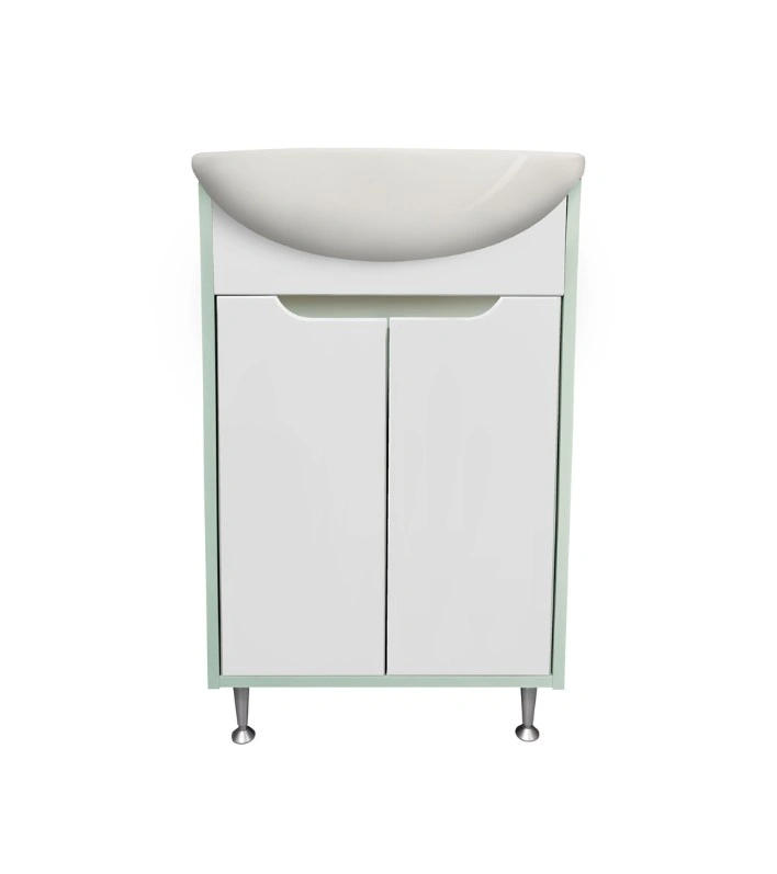 Тумба под раковину ЭкоНова (напольная) - это стильное сочетание корпуса бирюзового цвета с белыми фасадами из МДФ. Тумба в ванную с двумя распашными дверцами на петлях с доводчиками (верхняя петля с доводчиком, нижняя без доводчика) и одной встроенной полкой. В комплект также входят 2 хромированные и 2 пластиковые ножки. Тумба для ванной комплектуется керамической раковиной "Уют 60" (615*470 мм). Раковина глубиной 18 см. Мебель для ванной Руно - красота и практичность в мелочах!