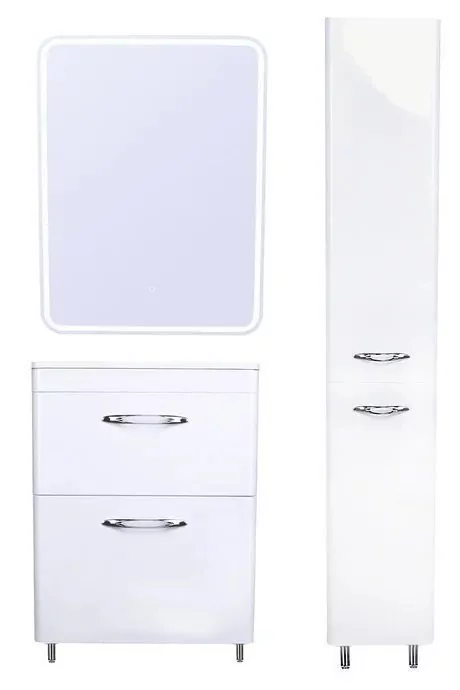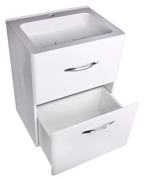 Размер тумбы: 600x450x824 мм. С механизмом доводчика, обеспечивающим плавное закрывание. Материал корпуса: МДФ. Покрытие корпуса: пленка. Материал фасада: МДФ. Покрытие фасада: пленка. Цвет фурнитуры: хром. Два ящика.