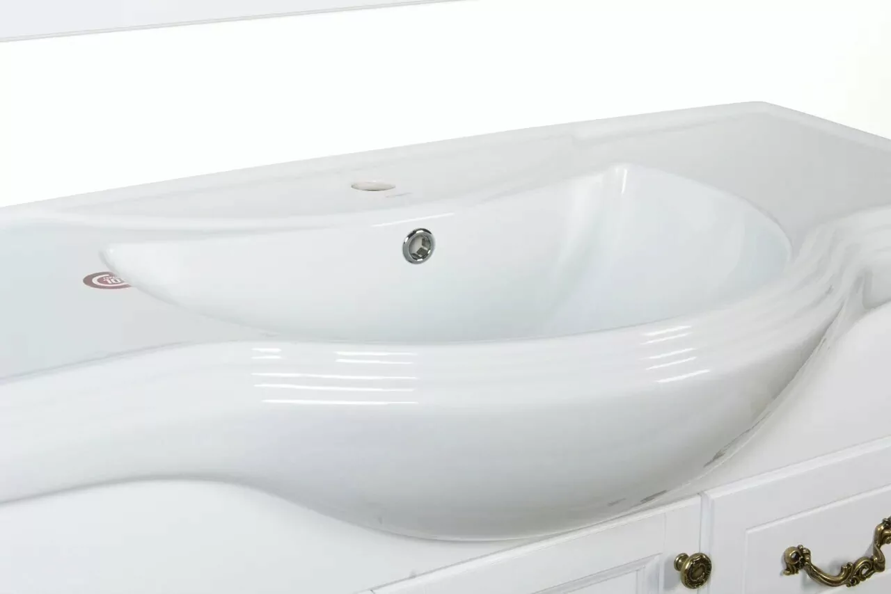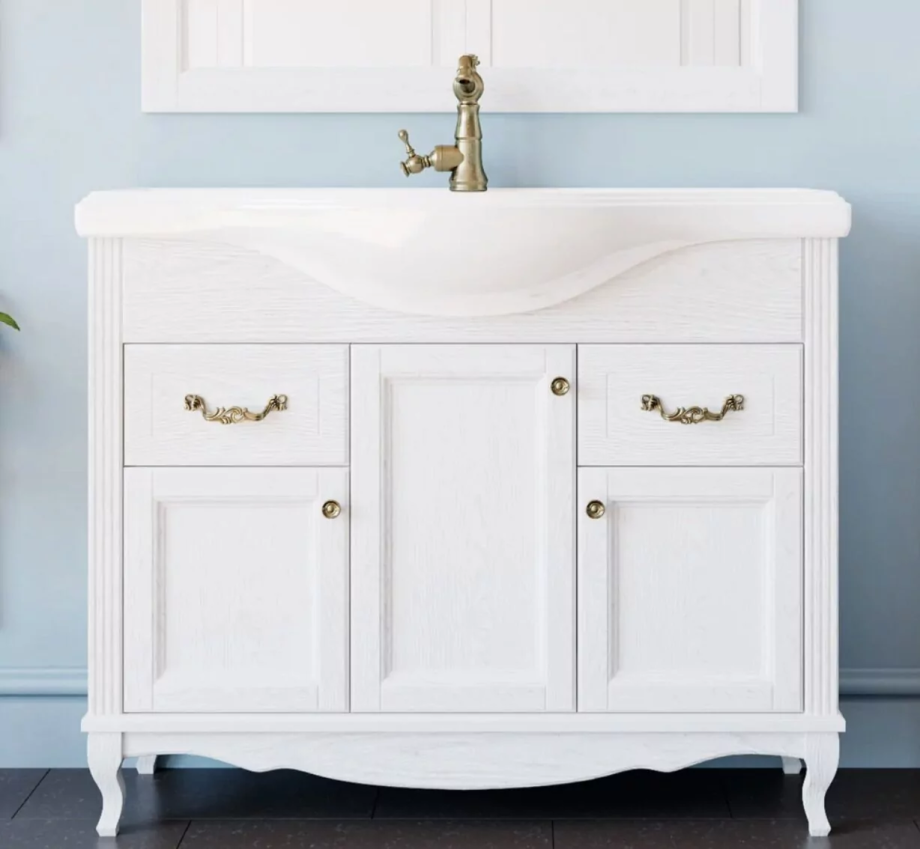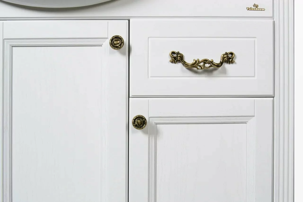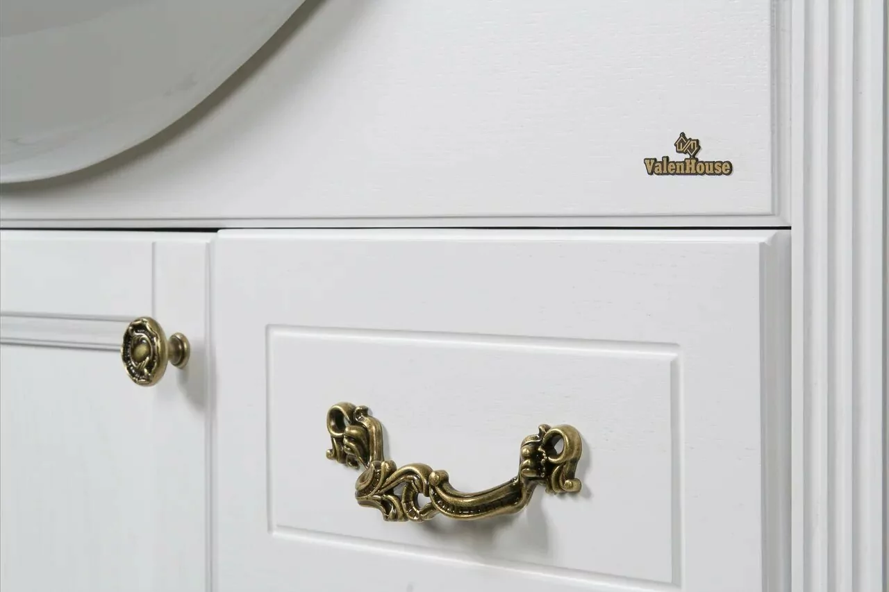 Дизайн модели ValenHouse Эллина-105 белый, ручки бронза превосходно дополнит интерьеры ванных комнат, оформленных в различных стилях: классическом, барокко, кантри. Комплект состоит из тумбы и мебельного умывальники.