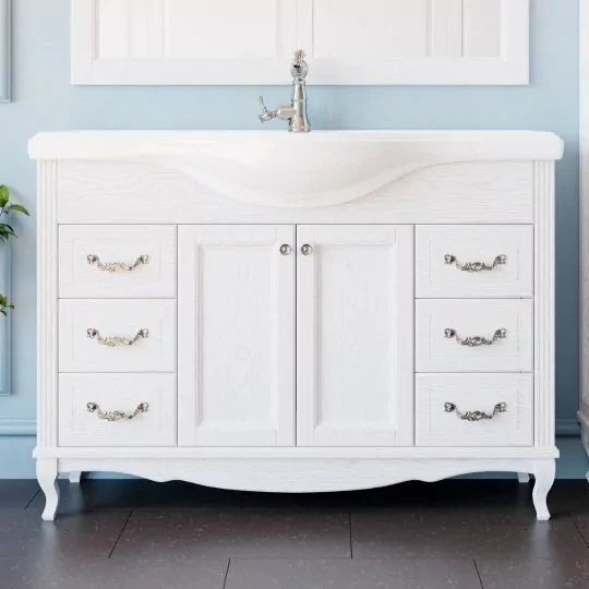 Тумба напольная ValenHouse Эллина 120 с раковиной Классик 120, шесть ящиков, белый, хром.