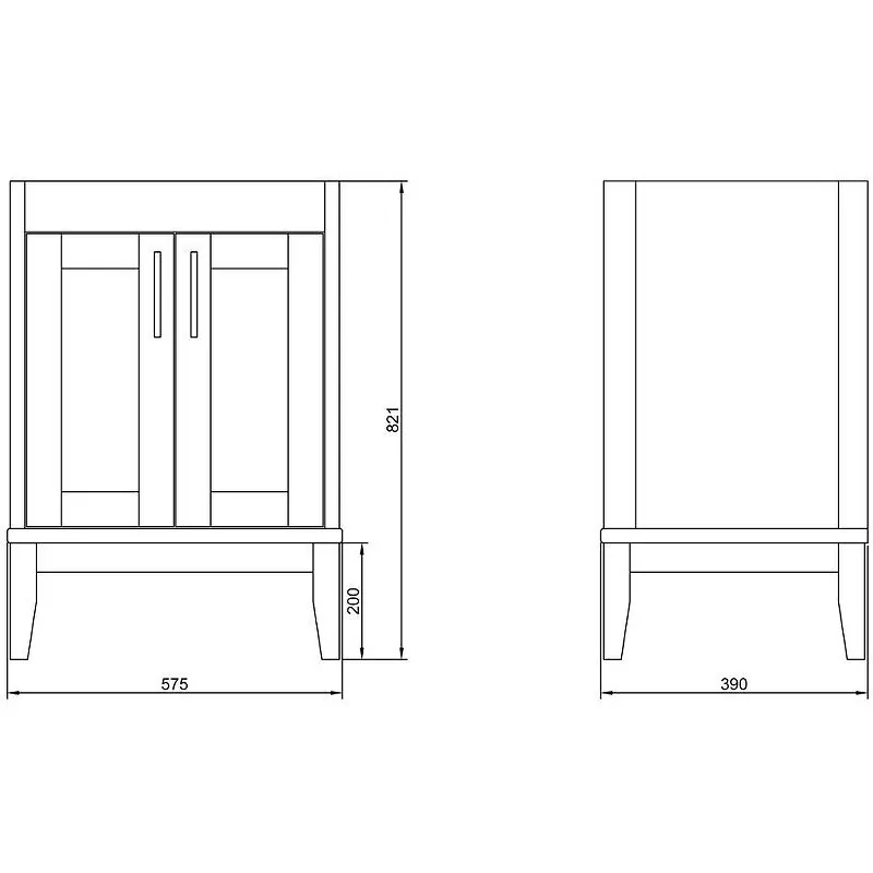 Размер: 575x390x821 мм. Напольная. С механизмом доводчика, обеспечивающим плавное закрывание. Материал корпуса: МДФ, массив ясеня. Покрытие корпуса: эмаль. Материал фасада: массив ясеня. Покрытие фасада: эмаль. Цвет фурнитуры: хром. Две дверки. Внутренние полки несъемные.
