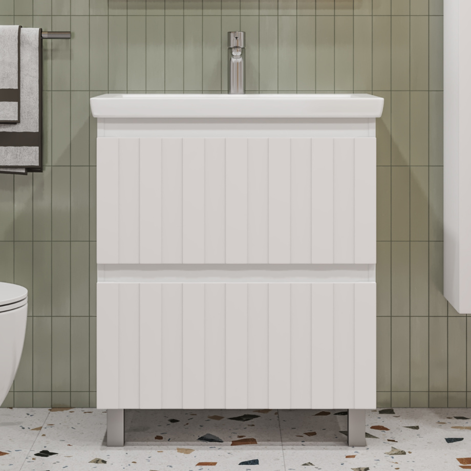 Коллекция Finlay 70 - это практичное решение для вашей ванной комнаты. Матовые фасады с фрезеровкой и интегрированные ручки создают эффект минимализма. Скрытые направляющие обеспечивают плавный ход ящика и комфортную эксплуатацию тумбы.