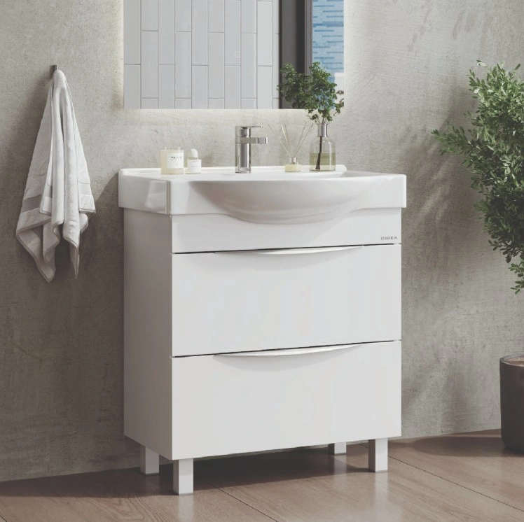 Два вместительных ящика обеспечивают удобное хранение, а изящные ручки, перекликающиеся по форме с линиями раковины, добавляют изысканности в лаконичный дизайн.