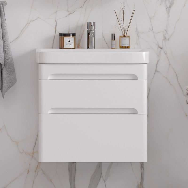 Подвесная тумба с двумя выдвижными ящиками в белом цвете под раковину из керамики. Ящики открываются при помощи интегрированных ручек. Направляющие оснащены доводчиками для плавного закрывания. Фасад тумбы изготовлен из МДФ и покрыт матовой эмалью. Корпус изготовлен из влагостойкого ЛДСП.
