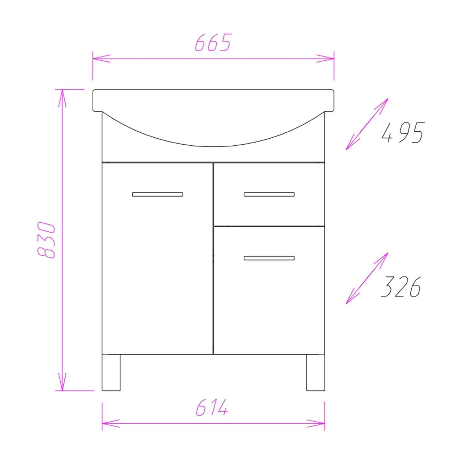Размер - 61,4x49,5x68 см. Напольная. С механизмом доводчика, обеспечивающим плавное закрывание. Материал корпуса: ЛДСП. Покрытие корпуса: ламинат. Материал фасада: МДФ. Покрытие фасада: пленка. Фурнитура: хром. Ящики / дверки. Внутренние полки несъемные.