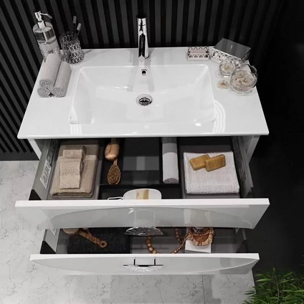 Данная модель не только позволит эргономично разместить необходимые принадлежности, но и скрыть элементы трубопровода. Тумба с раковиной Ибица 90 поможет заполнить свободное пространство в вашей ванной, при этом не загромождая его.