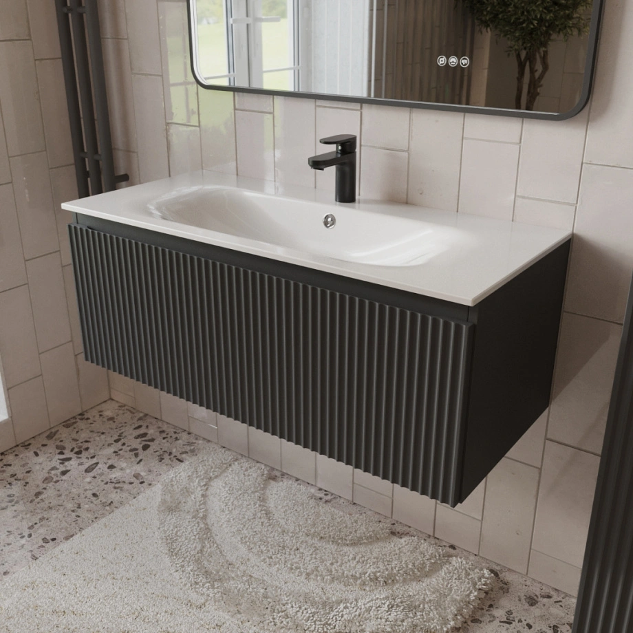 Тумба с раковиной подвесная (100см) Terminus Sicilia SIC101001701601O, графит . Раковина из литьевого мрамора в комплекте: диаметр отверстия под смеситель: 35, диаметр отверстия слива: 45 мм, диаметр отверстия перелива: 30 мм. Ширина тумбы: 1000 мм. Тип фасада: Волнообразная фрезеровка . Материал ящиков: ДСП. Количество ящиков: 1. Сифон и данный клапан приобретаются отдельно и в комплект поставки не входят. В тумбе установлена фурнитура Firmax. Система открывания: Фрезерованные ручки. Технология направляющих: Soft-Close, полного выдвижения, с доводчиком. Тумба поставляется в сборе. Гарантийный срок 2 года.