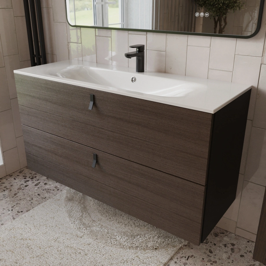Тумба с раковиной подвесная (120см) Terminus Kontur KON101202200001O, венге/графит. Раковина из литьевого мрамора в комплекте: диаметр отверстия под смеситель: 35, диаметр отверстия слива: 45 мм, диаметр отверстия перелива: 30 мм. Ширина тумбы: 1200 мм. Тип фасада: Фасад в шпоне эвкалипта цвета венге. Материал ящиков: ДСП. Количество ящиков: 2. Сифон и данный клапан приобретаются отдельно и в комплект поставки не входят. В тумбе установлена фурнитура Firmax. Система открывания: Металлические ручки . Технология направляющих: Soft-Close, полного выдвижения, с доводчиком. Тумба поставляется в сборе. Гарантийный срок 2 года.