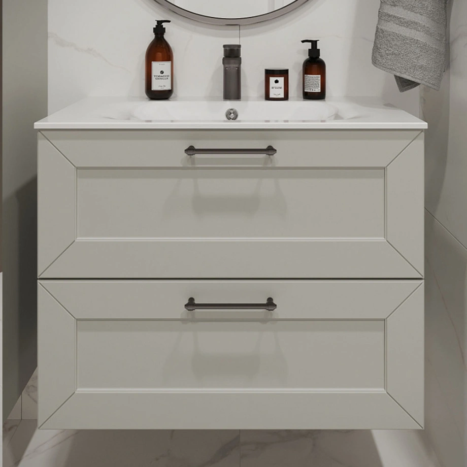 Тумба с раковиной подвесная (80см) Terminus Victoria VIC10802900301O, белый. Раковина из литьевого мрамора в комплекте: диаметр отверстия под смеситель: 35, диаметр отверстия слива: 45 мм, диаметр отверстия перелива: 30 мм. Ширина тумбы: 800 мм. Тип фасада: Филенчатая фрезеровка . Материал ящиков: ДСП. Количество ящиков: 2. Сифон и данный клапан приобретаются отдельно и в комплект поставки не входят. В тумбе установлена фурнитура Firmax. Система открывания: Металлические ручки . Технология направляющих: Soft-Close, полного выдвижения, с доводчиком. Тумба поставляется в сборе. Гарантийный срок 2 года.
