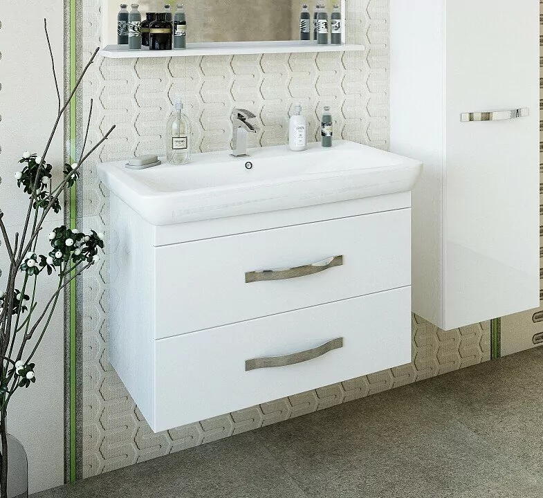 Габариты тумбы (Ш Г В): 74.6x44x51.6 см. Габариты раковины(Ш Г В): 80x47.2x19.5 см. Подвесная. С механизмом доводчика, обеспечивающим плавное закрывание. Материал корпуса: ЛДСП. Покрытие корпуса: эмаль. Материал фасада: МДФ. Покрытие фасада: эмаль. Фурнитура: хром. Ящики.