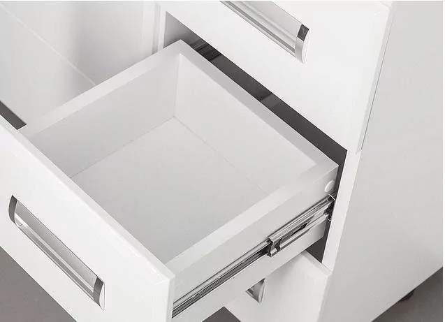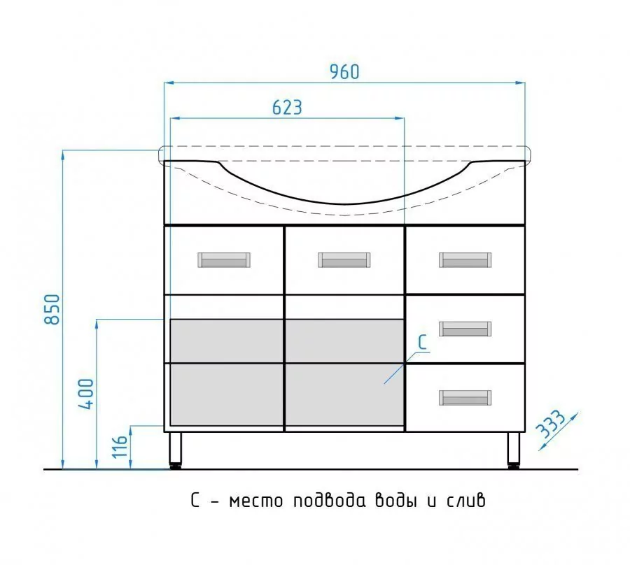 Размер тумбы - 960x333x850 мм. Напольная. С механизмом доводчика, обеспечивающим плавное закрывание. Материал корпуса - ЛДСП. Покрытие корпуса - ламинат. Материал фасада - МДФ. Покрытие фасада - пленка. Фурнитура - хром. Ящики/дверки.