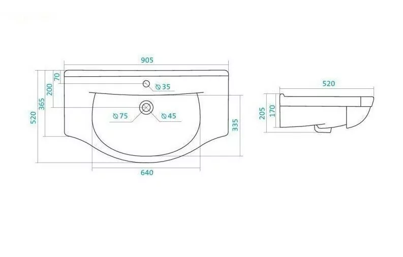 Размер раковины Santek Эльбрус: 905x520 мм. Материал: фарфор. Для сифона диаметром: 3.2 см.