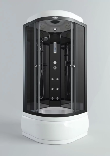 Поддон высокий 45 см. Фронтальные стекла серые тонированные. Задние стекла черные. Центральная панель стекло черное. Черный алюминиевый профиль. Регулируемые ролики. Хромированные ручки для дверей. 3-х режимный смеситель. Ручная лейка на штанге. 6 гидромассажных форсунок. Верхняя лейка «тропический душ». Стеклянная полка. Пульт управления с функциями: радио, свет, вентилятор. Слив-перелив с сифоном.