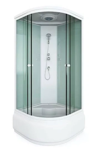 Поддон высокий 45 см. Фронтальные стекла: матовые фактурные. Задние стекла: белые матовые. Задняя панель: белый пластик. Белый алюминиевый профиль. Регулируемые ролики. Белые ручки для дверей. 2-х режимный смеситель. Ручная лейка. Слив с сифоном. Крыша с верхней лейкой.
