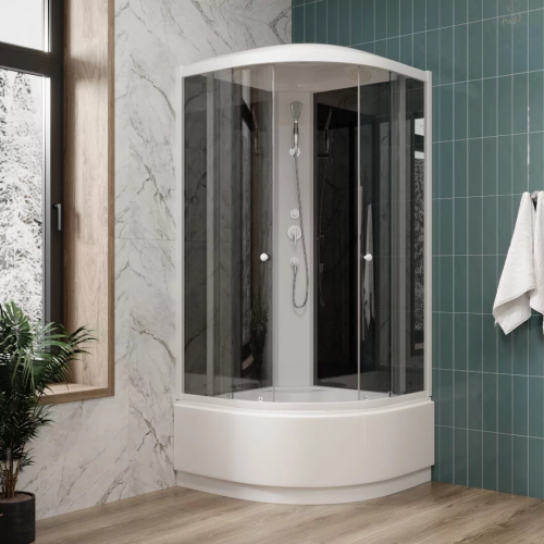 Поддон: Высокий. Форма поддона: 1/4 круга. Размер: 80x80 см. Высота: 215 см. Фронтальные стекла: тонированные. Задние стекла: черные. Центральная панель: нет. Профиль: белый алюминиевый. Ролики дверные: Регулируемые. Ручки дверей: белые.