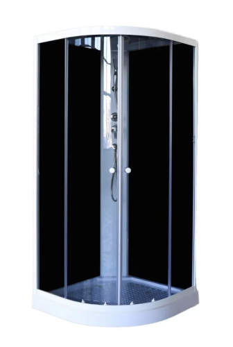 Поддон: Низкий. Форма поддона: 1/4 круга. Размер: 80x80 см. Высота: 210 см. Фронтальные стекла: тонированные. Задние стекла: черные. Центральная панель: есть. Профиль: белый алюминиевый. Ролики дверные: Регулируемые. Ручки дверей: белые.
