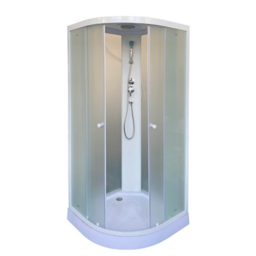 Стекло: 4 мм матовое, закаленное. Стенки: закаленное стекло белое, 4 мм. Профиль: белый, алюминиевый. Поддон: низкий 10 см., полукруглый.
