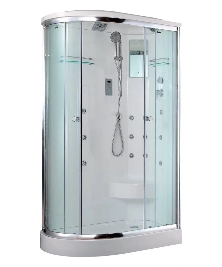 Габариты: 120x85 см. Верхний душ расположен в крыше кабины. Кабина оснащена гидромассажем. Раздвижная система дверей. Двери с прозрачным полотном. Дверцы из стекла. Ширина входа: 49 см. Имеет сенсорный дисплей. Оснащена встроенным сиденьем. С зеркалом. С полкой. Поддон кабины оснащен антискользящим покрытием. С гидромассажем спины / с боковым гидромассажем. Верхнее освещение. Кабина с вентиляцией. Установлено радио. Глубина поддона: 5 см. Акриловый поддон. Оснащение: сифон / душевой гарнитур.